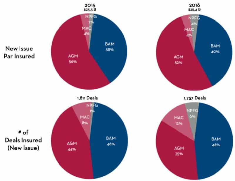 Importantly, BAM’s claims-paying resources also climbed in every quarter of 2016, reflecting the strength of our mutual insurance model. Without demands from shareholders for a quick payoff, we are free to manage BAM with a focus on building capital rather than generating financial returns through dividends or stock buybacks. That long-term perspective is also obvious in our low-risk portfolio of insured credits — 85% of BAM’s insured bonds carry underlying ratings of A-minus or better, and we have no exposure to Puerto Rico, non-municipal, or international credits.
