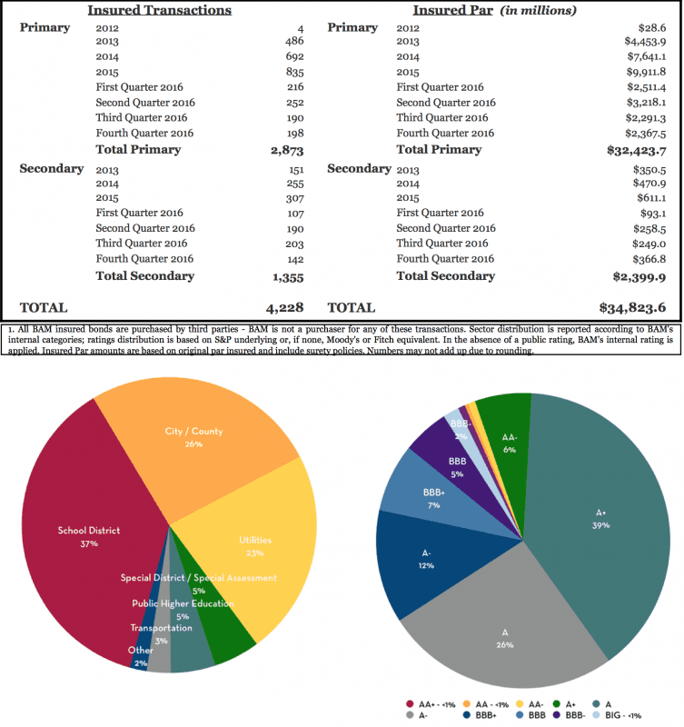 *As of December 30, 2016. All BAM insured bonds are purchased by third parties – BAM is not a purchaser for any of these transactions. Insured Par amounts are based on original par insured and include surety policies. Numbers may not add up due to rounding.